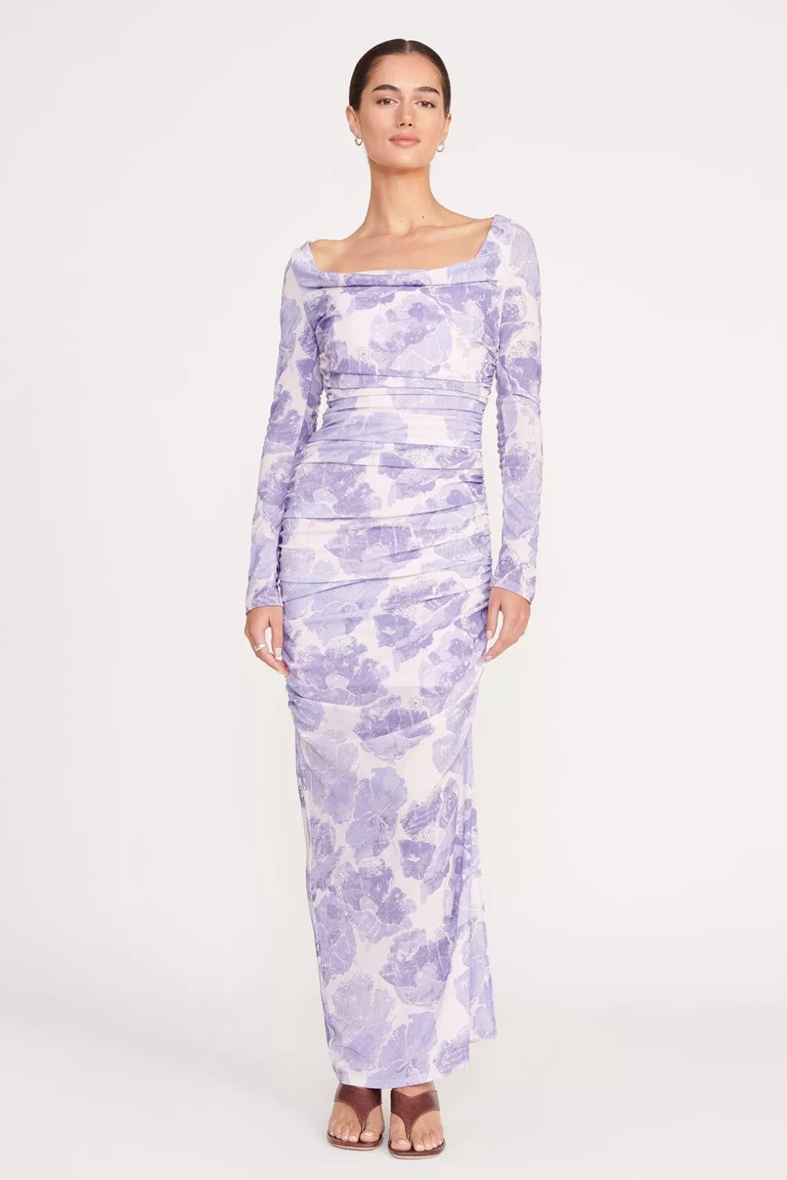 A long sleeve fitted dress made out of a printed mesh fabric, the Solana offers a draped cowl neck and side slit detail.