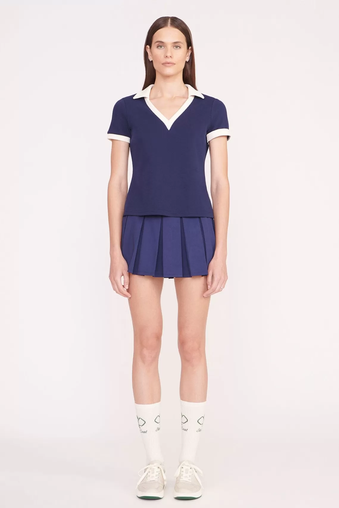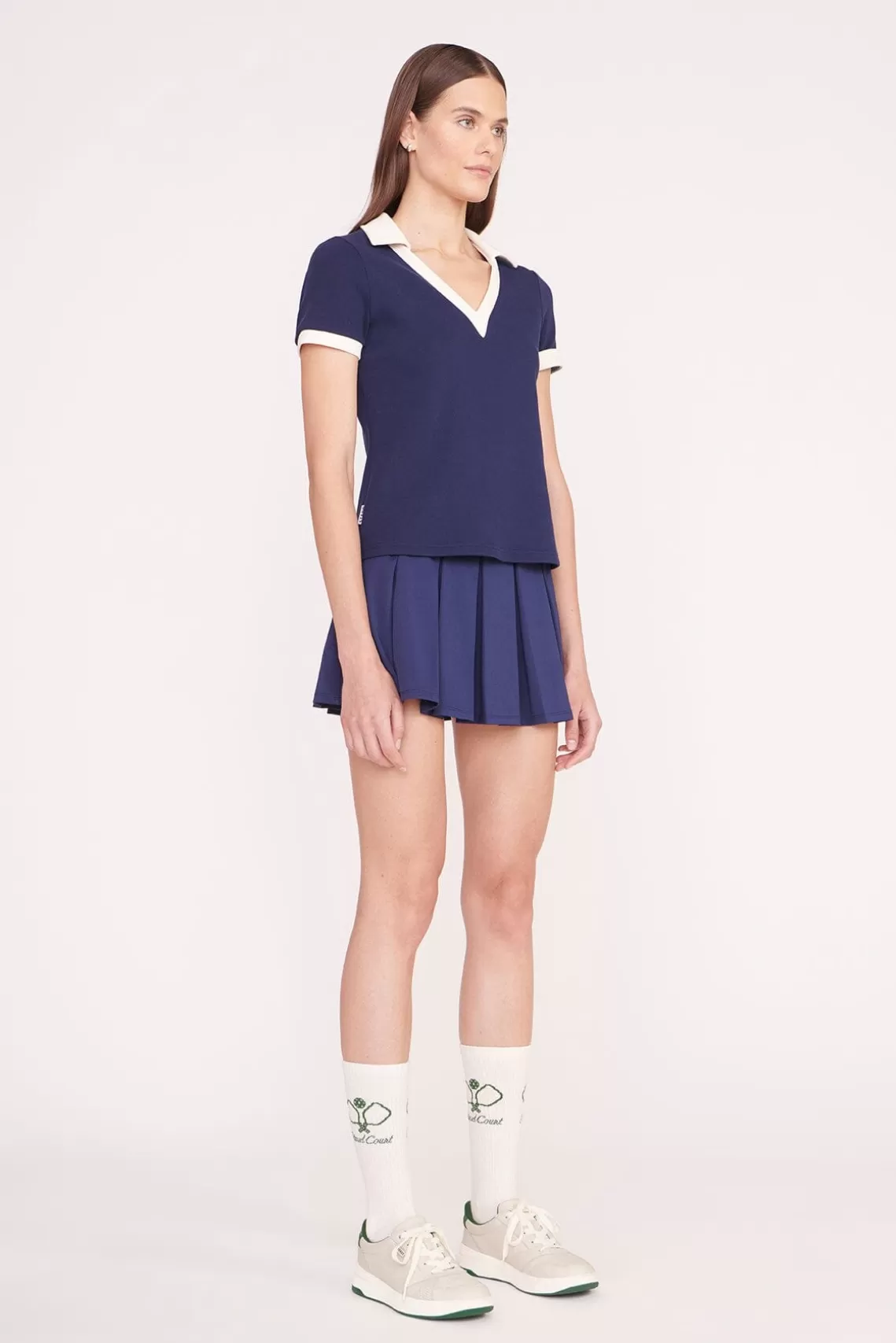 Cotton pique v-neck polo with contrast collar and sleeve bindings. The Volley Top offers a relaxed silhouette and completes a set when paired with the matching Doubles Skirt.